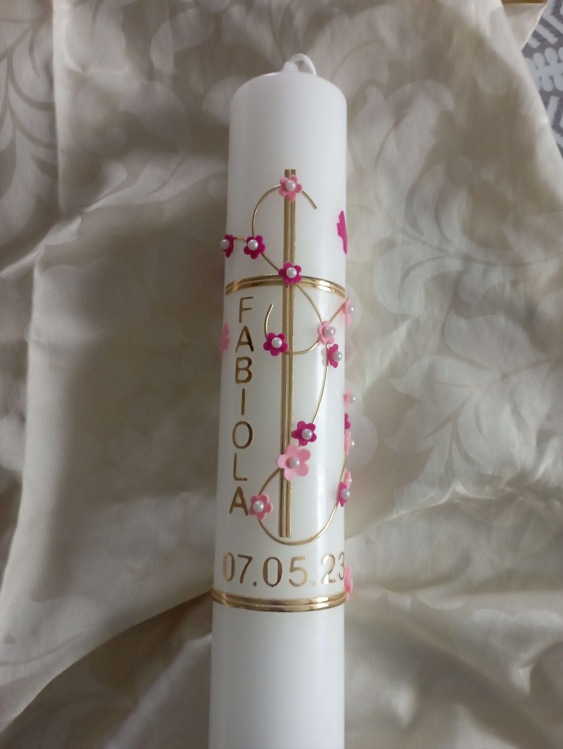 Die Kerze ist verziert mit einem schmalen Kreuz und einer Ranke mit Blüten. 2 Farben für die Blüten sind frei wählbar, diese sind mit Kerzennadeln im Perloptik befestigt